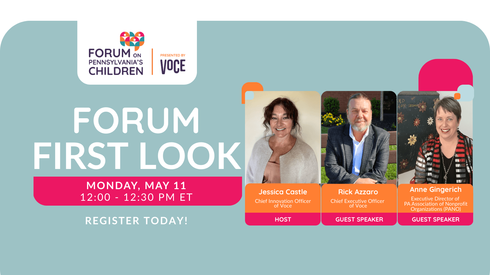 Join us for a free, 30-minute live webinar hosted by Jessica Castle, Chief Innovation Officer of Voce and featuring Rick Azzaro, CEO at Voce, and Anne Gingerich, Executive Director at PA Association of Nonprofit Organizations (PANO). The session will offer a preview of the sessions and conversations that will take place at this year’s Forum on May 28. It’s an easy way to learn what you’ll gain from the event—and will also help presenters tailor their content to your interests!